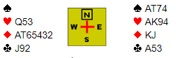 Slemmen er knallhard, og det skyldes nok at syd meldte litt som om han hadde stjålet kortene da han sa 3 spar. Etter 1 hjerter og 3 hjerter fra Ø/V liker han dog kortene sine, alle poengene er i de tre fargene som må dekkes opp, og makkeren har nokså sikkert singel hjerter.