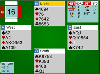 Brogeland-Lindqvist hadde større amibsjoner og heiste seg opp i 6 hjerter med førstnevnte som spillefører - en hardmeldt slem. Det er en komplisert analyse i dette spillet, alt etter hva vest spiller ut og hvordan det går videre. Det som skjedde var at Brogeland fikk kløver ut fra vest til esset. En kløver ble stjålet i andre stikk, så ruter mot bordet. Vest stakk opp og fortsatte med ruter til kongen før damen ble forsøkt, men øst satte i trumfåtteren, og syd måtte stjele over med kongen. Nå satte Brogeland i gang med krysstjeling, og det endte opp med en sluttposisjon hvor øst ble sittende i mellom med 10-2 i trumf foran syds A-7, et trumfcoup!