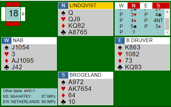 Ved det bordet hvor Nederland var N/S ble kontrakten 4 hjerter, og det ble elleve stikk, +650.