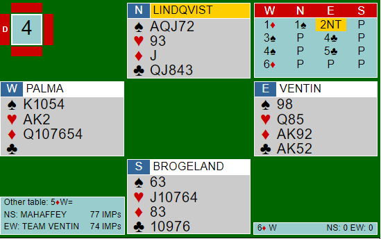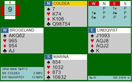 Brogeland og Lindqvist endte i 6 grand som skulle spilles av vest. Det var litt uheldig, for kontrakten er bedre om øst er spillefører. Ved de fleste andre bordene var 3 grand kontrakten, som regel spilt av øst, og da var det ganske enkelt å få tolv stikk, spesielt der spar kom i utspill fra syd. Det skjedde også ved det andre bordet i nordmennenes kamp.