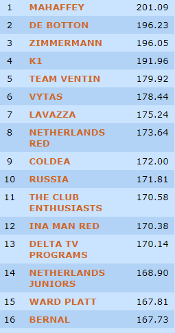 MAHAFFAY med Brogeland-Lindqvist slo Nederland med 11 IMP, mens ZIMMERMANN med Helness-Helgemo vant over LAVAZZA med 8 IMP!