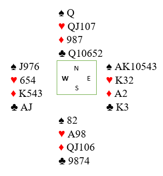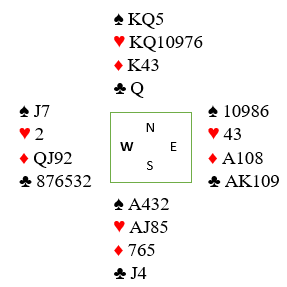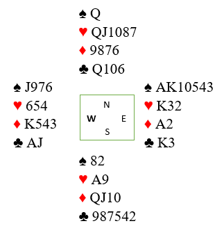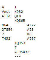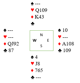 Merk det klassiske fordelingsmønsteret her; sidefargene (utenom trumfen og den «farlige» fargen ruter) begynner å bli eliminert. Da er det av og til duket for et innspill.
