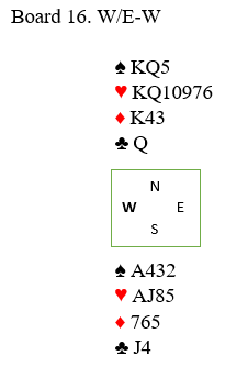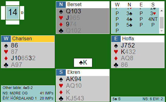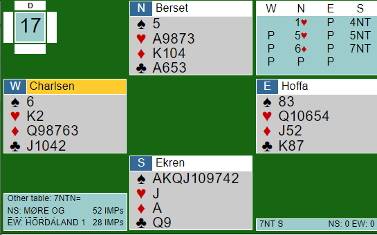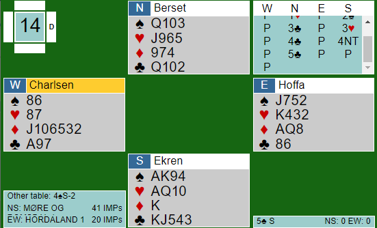 Tre par noterte +950 for 5 ruter doblet med ett overstikk som trolig skjedde etter kløver ut som satte opp stikk hos nord i den fargen, og øst klarte ikke å ta for hjerter ess da han var inne (?) så hjertertaperen forsvant. Det er fortstt noe arbeid, men de tre parene fikk i alle fall tolv stikk.