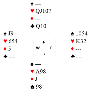 Ekren var altså i 5 kløver som heller ikke er nedlegg, men kontrakten har gode sjanser siden hjerterfinessen går. Det kom hjerter 8 ut til liten-liten, og syd vant stikket. Så trumf, og vest vant andre gang for å fortsette med hjerter som igjen gikk til liten - liten og syds dame. Den siste trumfe ble tatt ut med nords tier, så ruter mot syd. Øst stakk med esset og fortsatte med ruter dame da syds konge kom på under esst. Nå tok spillefører for hjerter ess før den siste trumfen ble tatt idet det så slik ut: