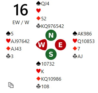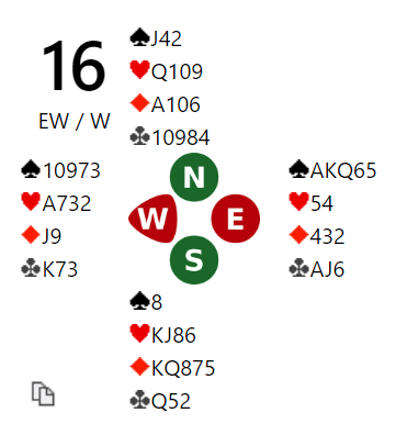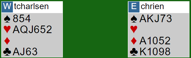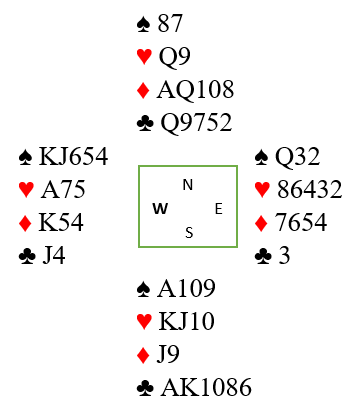 Jeg tråkket fullstendig feil i 6 kløver da jeg etter ruter ut til esset og sparavkast spilte to store kløver. Det så ut som det var svært gode sjanser om trumfen var fordelt 3-2, men da syd hadde kløver dame fjerde falt det sammen som et korthus. I ferd med å miste kontrollen mente jeg at etter den triste starten måtte sparfargen gå for å ha noen sjanse. Så sparfinessen ble tatt, men da syd tryllet frem damen og spilte to runder trumf ble det mer som om jeg var skyldig stikk.