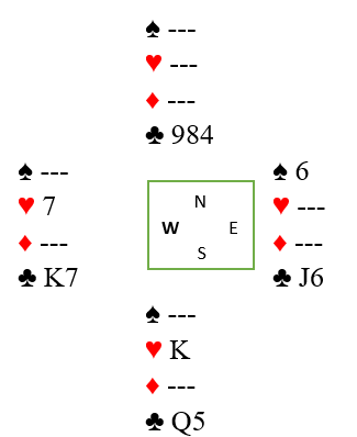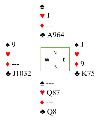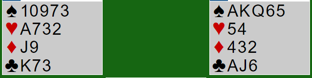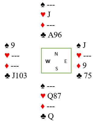 Syd spiller ut ruter konge og tar også for ruter dame før han skifter til trumf. Som sagt ser det ut til at dette vil avhenge av kløver dames plassering. Men det haster ikke med å ta den kløverfinessen. Du tar ut trumfen i tre runder. Nord startet med knekten tredje, og syd kastet i trumfrundene to ruter. Skvissjansen er at den med fire hjerter også har kløver dame. Hvis det er nord som har det har det ikke noen betydning, finessen vil jo lykkes. Det er hvis du velger å plassere syd med kløver dame at det blir interessant hvis han også har fire hjerter.
