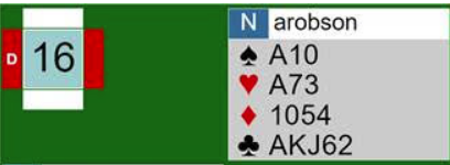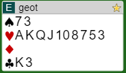 I en av kampene forrige uke fant jeg bl.a. en kamp hvor det egentlig så ut til å være ganske jevnt, men et sterkt lag med Tor Eivind Grude, Christian Bakke, Steffen Simonsen og Lars Arthur Johansen tok etter hvert en ganske grei seier. Det var en haug med slemmer og mulige storeslemmer i kampen. Her er ett spill hvor Grude-Bakke vurderte godt: