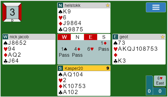 I dette spillet fra en online-turnering ble det en kamp mellom spillefører og motspillerne om å få satt opp sine stikk først.