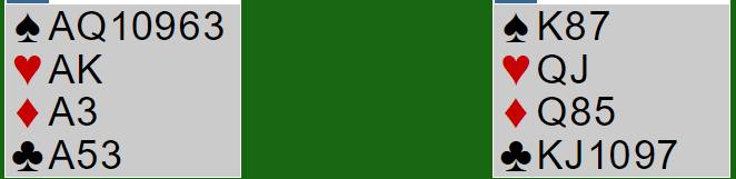 Spillefører la altså liten i andre stikk, og vest stakk med damen og skiftet til ruter konge. Da stakk spillefører med ruter ess og tok sparfinessen. Så hjerter til esset og nok en sparfinesse. K-Q i hjerter avslørte at øst hadde stopper. Øst måtte få komme inn i hjerter, for spillefører har ikke nok stikk uten godspilte hjerterstikk. Øst spilte ruter, og to ruterstikk til Ø/V sammen med de to i kløver i starten og ett hjerterstikk ga en bet.