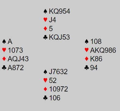 Ved bordet la spillefører kløver knekt i andre stikk. Den ble stukket med damen, og nå kunne ikke kontrakten vinnes lenger hvis det korrekte motspillet ble funnet! Slik så hele spillet ut fra start: