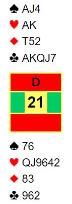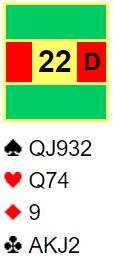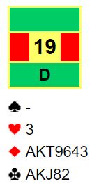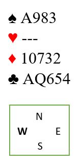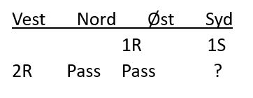 Nicolai meldte 2 spar. Jeg vet ikke sikkert hva deres avtale er for den kravmeldingen (øst har vist minst fem spar), men som du ser kan det tyde på at det viser ruterfarge for dem. Meldingen 2 hjerter kan også brukes som en kravmelding her og i å fall vise kløver. Dermed har man to måter å melde en av minorfargene, en melding for sterkere kort, en for å konkurrere i meldingsforløpet.