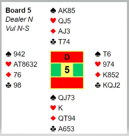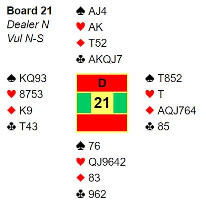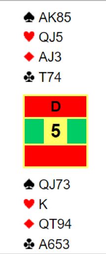 Ved det andre bordet ble 5 ruter kontrakten. Det var ikke store problemer for Terje Aa i lilleslemmen. En spar kan stjeles hos syd, og den femte kløvern kan godspilles selv om fargen er fordelt 5-1. Nok en slemsving inn for Heimdal på veien mot klar seier over de regjerende norgesmestrene.