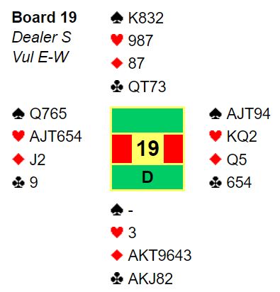 Vest var med til 3 hjerter, og Thor Erik foreslo 3NT. Vest var ikke heldig da han var med en gang til med meldingen 4 hjerter. For nå visste Thor Erik at syd måtte ha maks singelton hjerter, så etter paret først stoppet i 3NT smalt nord til med 6 kløver!