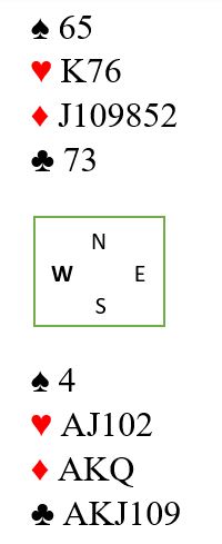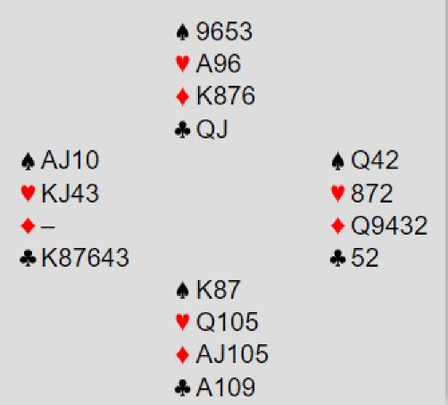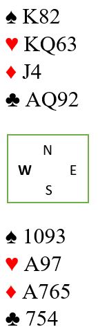 Øst får første stikk for kløver konge og fortsetter fargen. Vest vinner så for hjerter ess og spiller ruter, men du går opp med esset og tar ut trumfen, så QJ i hjerter med avkast av to kløvere fra syd. Deretter får Ø/V kun for ruter konge - ti stikk.