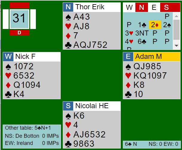 Ved det andre bordet spilte N/S 3NT. Thor Erik hadde ingen problemer i lilleslemmen, og da kløver konge satt i saks tok han tretten stikk, +1390 og 13 IMP inn.