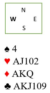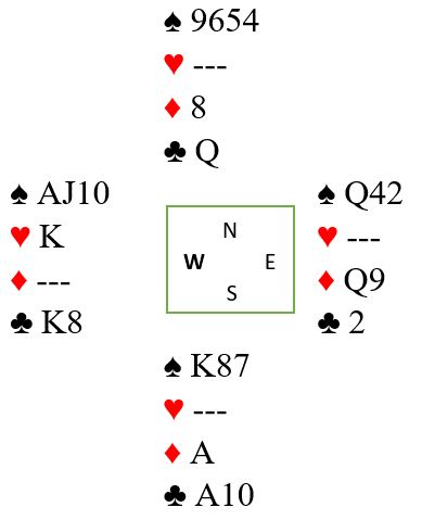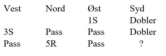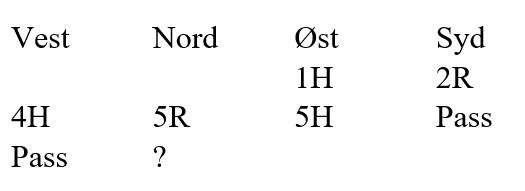 Som syd har du blitt spillende 4 hjerter ettter at øst har vært innpå med en sperremelding i ruter. Vest spiller ut ruter konge som øst stikker over med esset og tar for ruter dame, vest følger farge. Så kommer ruter knekt fra øst. Hva gjør du nå?