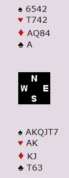 Det er vel flere måter å gjøre det her på, men de fleste måtene bør vel føre til 7 spar. Om nord undersøker (for eksempel via Stenberg 2NT) kan han få vite om kløverkontroll hos syd, og idet han også får vite at trumfen er god nok via Key Card Blackwood må konklusjonen bli storeslem i spar. Nord kan også hoppe til 4 ruter direkte over 1 spar. Uansett har nord så stort stikkpotensiale at han blir storeslemsinteressert.