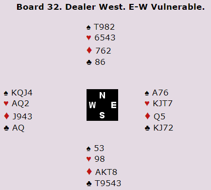 Siden hjerterfargen sitter 3-2 står det også tretten stikk i grand, men å melde 7NT er gambling. Ett par var i 6NT med tretten, men det ga godt under middels selv om de slo en del par som var i i 6 spar. Nederst på listen finner vi imidlertid et par besynderlige resultater: