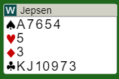 Og det ble ikke så lett for ROSENTHALs Ø/V da Willenken passet i åpning der Jepsen altså åpnet med 1 spar. Så de stoppet i delkontrakt!