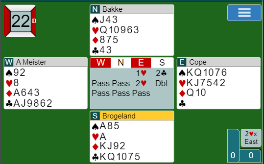 Vest satt vel og gned seg litt i hendene da Brogeland meldte inn 2 kløver og håpet nok at makkeren ville doble opplysende i gjenåpningssiutasjonen. Da ville det blitt pass rundt og ikke noen hyggelig kontrakt for syd. Men det er ikke altid åpneren har en hånd egnet for motspill i sånne situasjoner, og øst valgte med dette å gjenåpne med 2 hjerter. Da Brogeland hadde en meget god hånd, og bra tilpsning til alle farger utenom hjerter doblet han opplysende. Bakke passet ut. Kontrakt 2 hjerter doblet av øst.