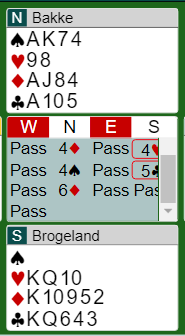 6 kløver bød ikke problemer siden kontrakten kom på vest sin hånd. Om øst er spillefører blir det ganske automatisk bet om syd spiller ut hjerter. Vest sin 1 kløver var sterk, kunstig melding. Morten Bilde sin 2 hjerter var et svakt innhopp. Og her hadde Ø/V en god avtale, 2NT viste kløverfarge. Vests løft til 6 kløver over 5 kløver var vel litt frisk, men blink.
