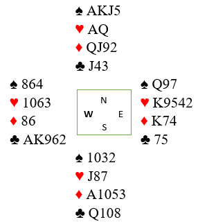 Forskjellen er dog enorm da han slik det satt var inne hos nord etter første stikk. Så ruterfinesse, og underveis i de tre første ruterrundene passet han på å avblokkere sånn at syds fjerde ruter var størst, også viktig som du skal få se om litt. Så spilles kløver som forærer vest stikkene i den fargen.