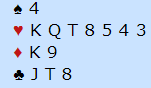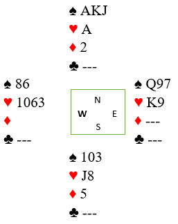 Vest kunne ta fire kløverstikk. Fra nord kastet da Geir en spar og hjerter dame. Det ble igjen disse fem kortene hvor øst fortsatt hadde stopperne sine: