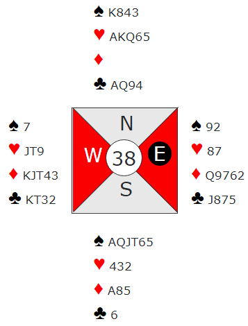 Vest spilte spar til esset. Nå er overgangene i orden! Hjerter ess ble innkassert, så ruter til syd femmer, inne på riktig hånd, der hvor hjerter knekt var – trusselen mot øst.