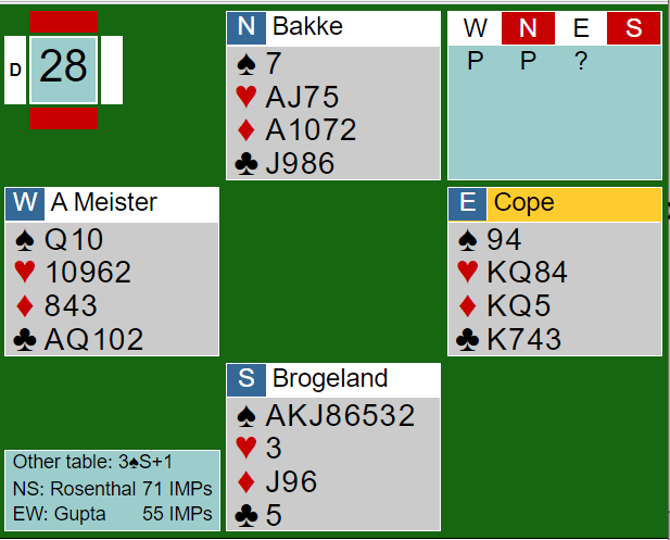 Den doblede delkontrakten var på ingen måte rett frem å vinne, men Cope spilte godt etter kløver konge ut til esset og ruteravkast. Han trumfet kløver med det samme og spilte stor spar som ble lasjert. Så den andre store sparen for å få syd inn. Hvis ikke syd spiller trumf nå får spillefører trumfet en spar med vests singel trumf, og vil til slutt ende opp med minst åtte stikk. Boye tok for trumfesset. Men spillefører fikk senere trumfet seg ned og fikk til slutt så mange trumfstikk at det endte med +670 til Ø/V.