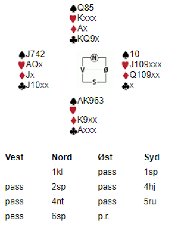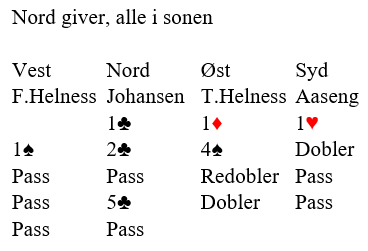 Nord åpnet med 3 spar, og Tøsse meldte inn 4 kløver. Syd passet og vest meldte 4 hjerter før Tøsse tok sjansen på 6 kløver med sin fordelingsterke hånd - en ikke urimelig sats.