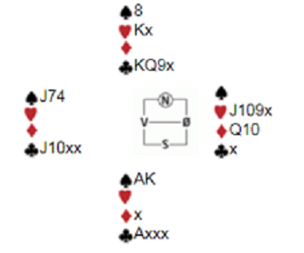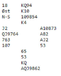 Vinnerlagets øst spilte ut hjerter 2, mens toernes øst forsøkte en liten spar. Hjerterutspillet var blink da hele spillet så slik ut (jeg tar forbehold om at kanskje vest hadde fått vist hjerter underveis, men uansett er det selvsagt litt tilfeldig med slike utspillsvalg):