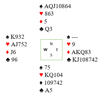 Ekstrem fordeling med såkalt dobbeltilpasning begge veier. N/S kan vinne 6 kløver og Ø/V kan vinne 6 spar! Men det går galt om det spilles med en av de to andre ni-korts tilpasningene, hjerter (N/S) og ruter (Ø/V), siden motspillerne kan få stjelestikk. Her er hva som skjedde ved det ene bordet hvor min informant var tilstede, og som han sa: "Her var det vel flere av oss som gjorde litt rare ting?":