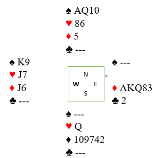 Øst spilte kløver 2 og syd måtte kapitulere. Enten måtte han kaste hjerter dame slik at knekten ville gi stikk, eller gi opp ruterholdet!