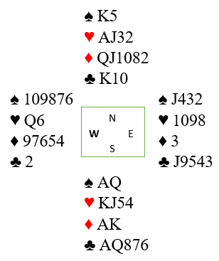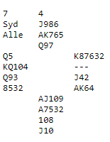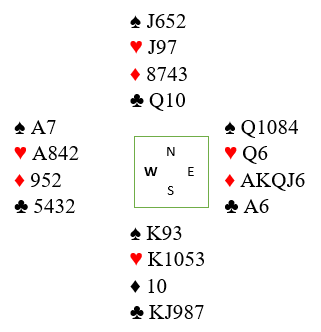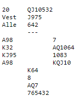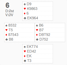 Det er altså etter min mening veldig pushy å melde slem, men never argue with success! Kun to par meldte og vant 6 hjerter. Tre par til meldte slem, men uvisst av hvilken grunn vant de ikke tolv stikk. For det handler vel kun om ruterfinessen her? Med spar ut til esset bør spilleplanen være å sjekke hjerteren med liten til honnør hos øst og liten tilbake til kongen. Da oppdages sitsen, og en markert finesse tas over nords trimfknekt fjerde. Deretter er det ikke noe annet å gjøre enn å ta ruterfinessen? Siden den går blir det en meget fet +1430 til notering.