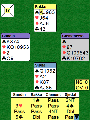 I dette spillet ble de enklere med 1 ruteråpning som svensken valgte, mens nordmannen på vests plass sa 1 kløver. Slik så hele spillet ut: