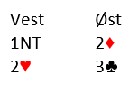 Det norske paret ved det andre bordet fikk ikke ruterfargen på bordet etter 1 kløver fra vest. Nord meldte inn hjerter, øst viste spar, og før Ø/V visste ordet av det var N/S i 3 hjerter. Skulle øst konkurrere på firetrinnet uten å vite om tilpasning hos makkeren? Det var klart for øst at makkeren hadde noen hjertere, tre og kanskje fire, så 4 ruter behøvde ikke være så gull. Svenskene fikk spille 3 hjerter som gikk en bet.