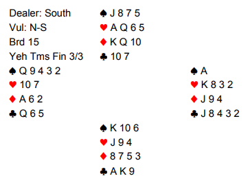 Da kineseren på syds plass åpnet suste de ut i utgangen 3 grand med syd som spillefører. Sementa åpnet ikke ved det andre bordet. Jeg holder med Sementa, den «søppelhaugen» der er ikke åpning. Men i den kinesiske meldestilen åpnes nesten alltid med 11 poeng.