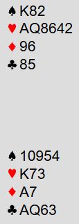 Sunndalsøra sin nord åpnet med 1 hjerter, og syd svarte syd 2 kløver. Det var en tvetydig melding som kunne innebære litt forskjellige ting, og nord sa 2 ruter som viste ekstra verdier. Det tre første meldingene ble alertert. Da meldte syd 2 spar som var naturlig, og det viste minst fire spar og minst femkorts kløver vil jeg anta. Nord hoppet til 4 hjerter, og da spurte syd om nøkkelkort med 4NT (inntil videre med hjerter som trumf). Nord viste to nøkkelkort og trumfdamen, altså vet syd at nord har AKQ i hjerter og sannsynligvis syvkorts farge. Syd avsluttet meldingene med 7NT.