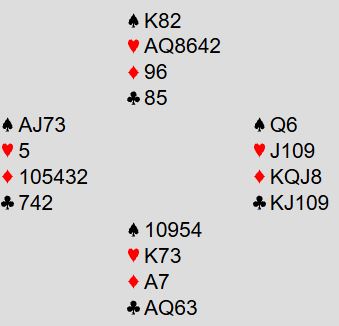 Paret som hadde den nevnte misforståelsen lot seg ikke vippe av pinnen av den grunn. Noen få spill senere meldte de slem igjen. Gode vurderinger førte til den fine lilleslemmen 6 ruter med kun 27 HP til sammen. Det stod riktignok i 7 ruter, men det var pga. helt perfekte kort mot hverandre: