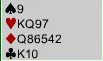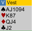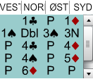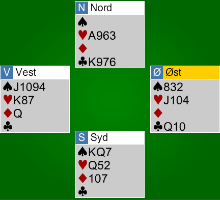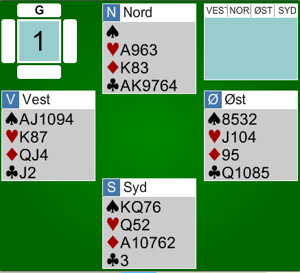 Østs kort ser nesten ikke ut som en åpning. Undertegnede er ikke tilhenger av tynne åpninger med flate, balanserte hender og bare 11 hp. Dette er dog 12hp selv om det kanskje nesten ikke ser sånn ut. Og med 12 ville i alle fall jeg åpnet. Med 1 ruter...