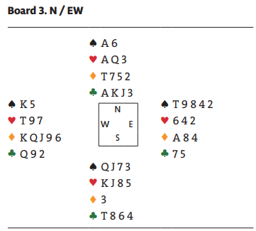 Ingen kan vite med sikkerhet hva som er riktig. Jeg tror imidlertid det oftere er riktig å passe med denne flate hånden. Det behøver selvsagt ikke være best i 3NT. Makker har imidlertid bare foreslått 3NT, og han kan godt ha en dårlig dobbelton i spar eller kløver, eller tre små i en av de fargene. Men er 4 hjerter noe særlig bedre da? Det er ikke sikkert nord har 5-3-3-2 fordeling en gang. Likevel, sjansen for at 3NT er minst like bra som 4 hjerter må være ganske stor, og det kan godt være at det er soleklart bedre i 3NT også, for eksempel om det er fire topptapere, men likevel ni stikk i grand.