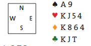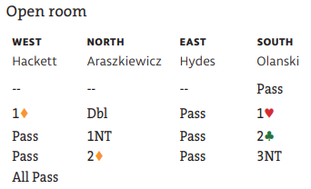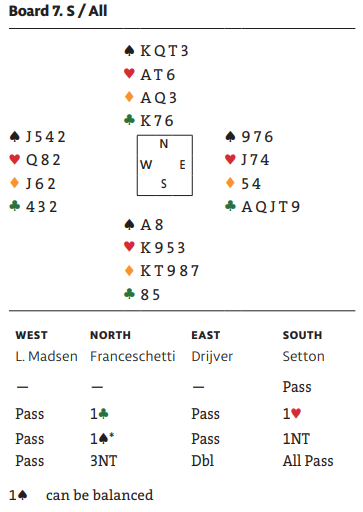 Det går an å si 1 spar, men for mange er dette en enkel hoppmelding til 2NT i andre melderunde for å vise 18-19 balanserte. Da vil man måtte ha en metode for å finne en eventuell spartilpasning, for eksempel et opplegg med Check-Back. Det er imidlertid enkelte steder i Europa man melder 1 spar i andre melderunde med slikt. Det ble hva nord gjorde, og over 1NT fra svarhånden sa nord 3NT. Da doblet Sjoert Brink (øst), og ingen hadde noe å tilføye.