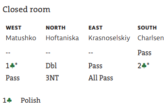 Merk Charlsens 2 kløver som svar på doblingen. Det viser en invitthånd (normalt 8-9 til 11) med begge major. Det har han til, i majorkontrakt er vel hånden ca. 10 poeng. Og det er jo veldig sannsynlig dobleren har en majorfarge. Over 2 kløver avsluttet Hoftaniska med 3 grand.