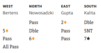Curtis Cheek åpnet med Multi 2 ruter, og Huub Bertens spurte med 2 grand. Merk at Brogeland (nord) passet i første omgang med kort som mange antagelig ville tråkket til så høyt de kan med det samme, spesielt i gunstig sone. Passen førte faktisk til en misforståelse mellom øst og vest. Her hadde ikke Bertens-Cheek gode nok avtaler i den litt uvanlige situasjonen at det kom en innmelding andre gangen.
