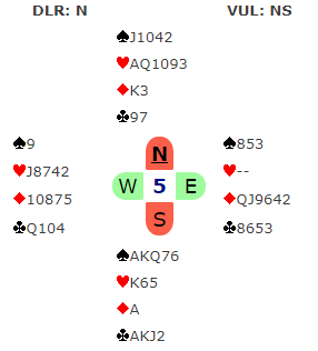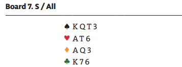 Grude klinket til med 3 spar i ugunstig sone etter mottoet (som jeg liker) «syv-korts farge er syv-kortsfarge!». Idet Bakke meldte hjerter, og nord (Lorenzini) gikk innpå med 5 kløver hadde Grude såklart til å støtte. Bakke meldte slem over syds (Bessis) 6 kløver, og spillet var allerede vunnet mot resultatet ved det andre bordet siden hjerterslem er bombesikker.