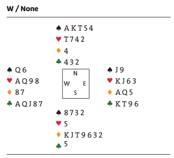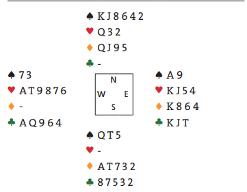 Etter en runde trumf fortsatte han med ruter ess og ruter til damen. Øst fulgte begge gangene. Nå var resten barnemat for lagkapteinen på vinnerlaget. Han spilte spar til finesse med nieren fulgt av ruter konge som øst måtte trumfe, og dette var blitt situasjonen: