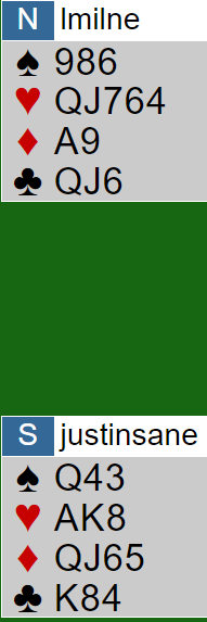 Ved det andre bordet spilte syd 4 hjerter. Etter spar ut dukket spillefører en hjerter til øst, og dermed fikk spillefører elleve stikk i utgangen på 4-3 tilpasningen. Det var sikkert litt skuffende å se at +650 ga 11 tapte IMP.