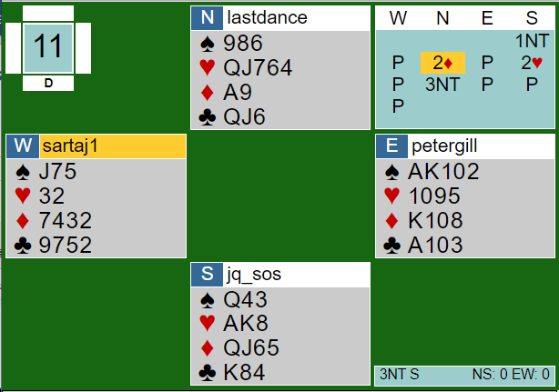 Det er jo sånn at når man dobler 3NT for utspillet bør man ha en veldig god farge. I dette tilfefllet fra ALT INVITATIONAL MIXED TEAMS på BBO opplevde nederlandske Sjoert Brink at fargen hans var for god!