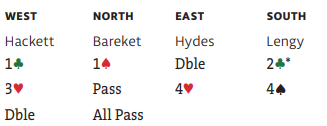 Øst spilte ut hjerter 6 til vests ess. Med den truende ruterfargen hos syd ser vest at det antagelig ikke nytter å spille trumf, og Hackett (vest) skiftet til kløver ess fulgt av kløver dame i et forsøk på å korte syds trumf før ruteren blir etablert. Spillefører trumfet kløverspillet og spilte trumf til kongen og ruter mot syd. Øst stakk med esset, og nå kunne forsvaret spille trumf! Med kun en trumf igjen hos syd etter østs trumfskift kunne ikke ruteren både godspilles og hentes. Spillefører kunne ikke unngå mange tapere på hånden selv om en taper kunne trumfes og en kastes på ruter konge. Det ble likevel bare åtte stikk, to doblede bet og +300 til lag De BOTTON. Det var sammen med +690 fra det andre bordet verd 14 IMP.