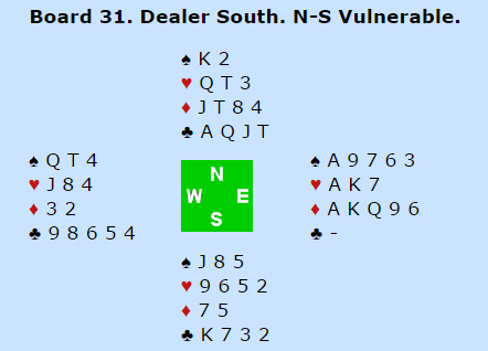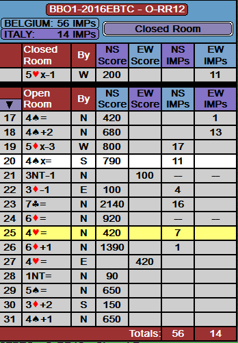 I spill 31 meldte Italia 6 spar og gikk bet. Double Dummy kan den vinnes på en sær skvis (spilt av syd), men i praksis var det mer normalt å spille på hjerter ess foran. En bet, og mer glede for Belgia. Belgierne var nok storfornøyde med denne fin-fine storseieren i en veldig morsom kamp. Sluttresultat: 79-25 (19,52-0,48 VP). Det gjorde at Italia falt til 10.plass.